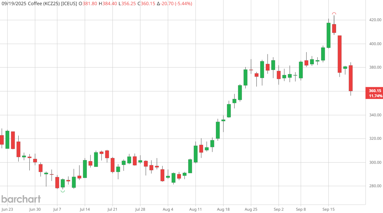 Using Barchart’s Futures Market Overview, traders can see performance leaders across markets. And prior to this week’s liquidation, coffee had outperformed even metals like silver (SIZ25) and gold (GCZ25) — signaling just how strong the move has been.
