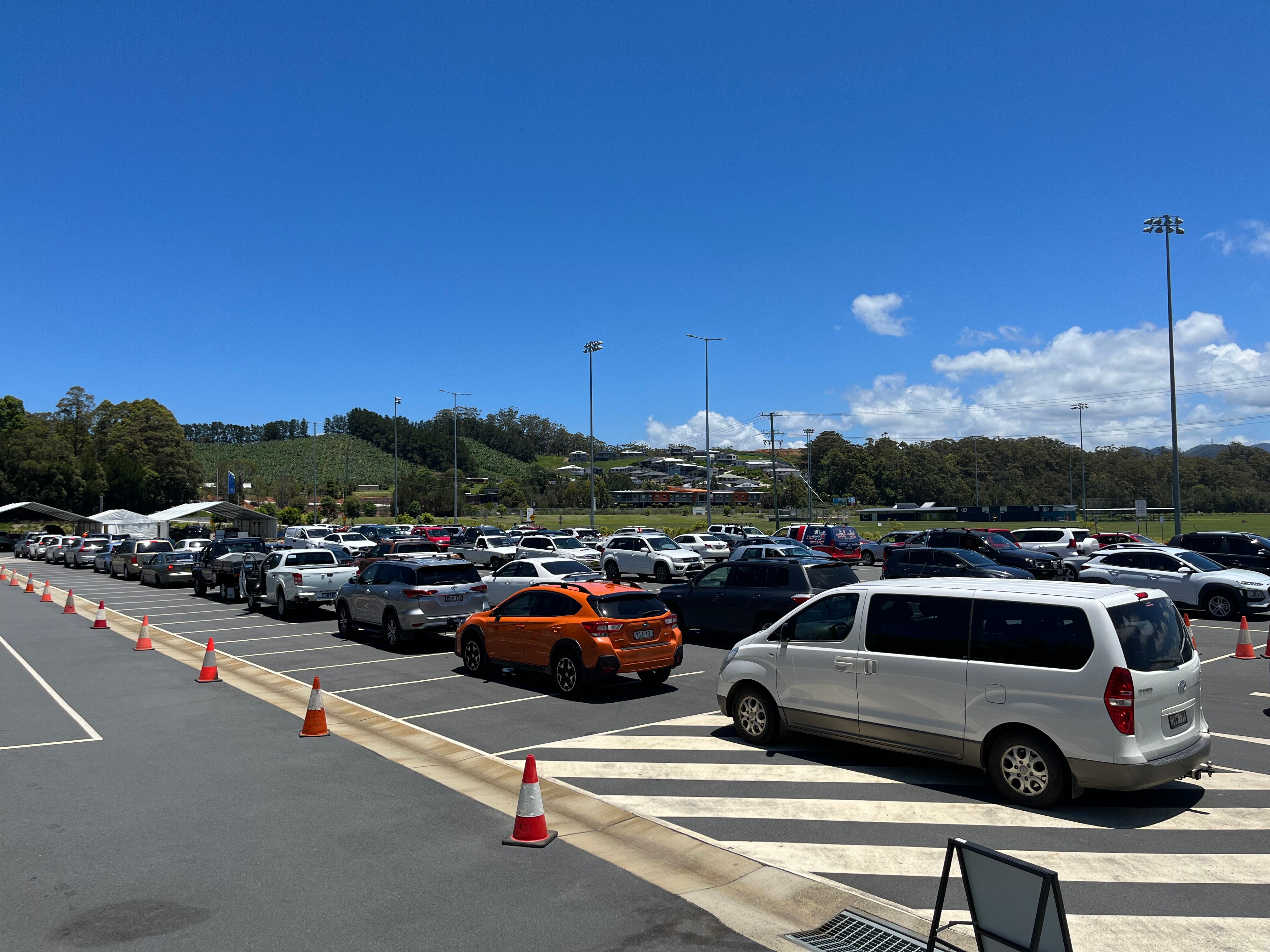 Officials at the Coffs Harbour Stadium drive-through clinic warned of wait times of up to three hours, as they worked to administer more than double the amount of tests as this time last week.