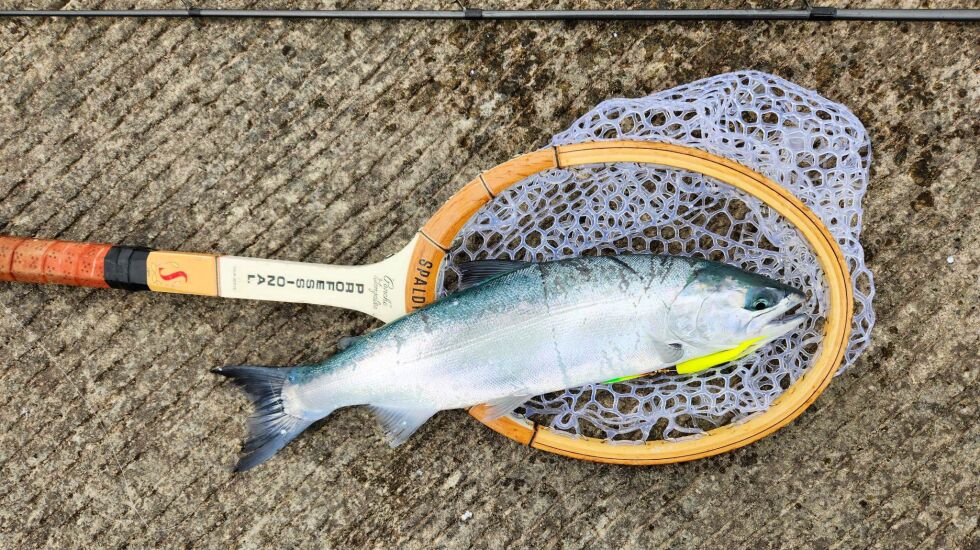 The net with the coho caught my eye. He made a Spalding professional tennis racket from the 1980s into a fishing net.