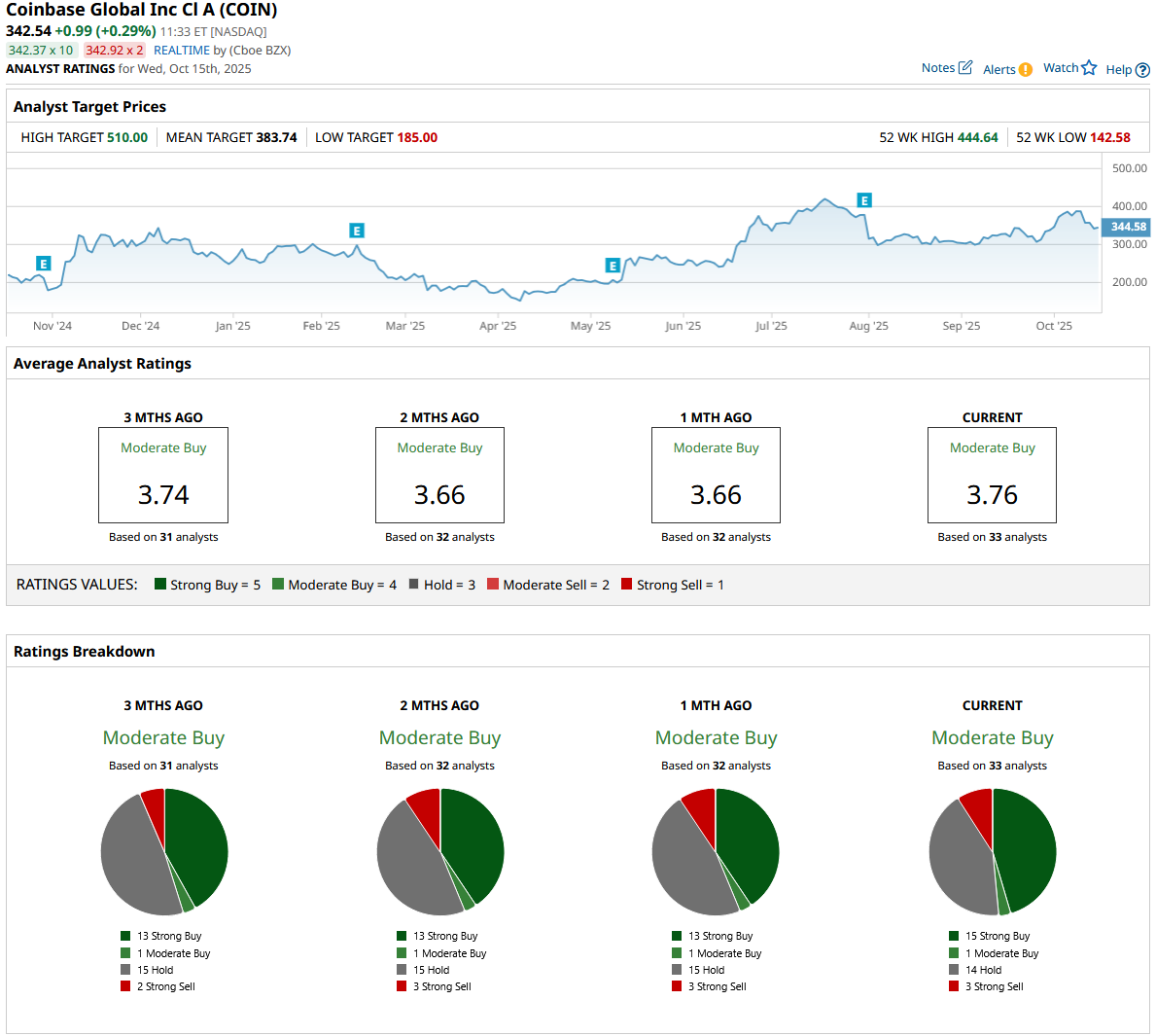 Overall, 33 analysts cover Coinbase, and the group leans to a consensus “Moderate Buy” rating, settling on an average price target of $383.74. That gives the stock a potential upside of about 11% from its current level.