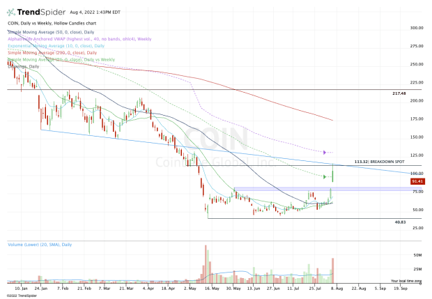 With today’s action, Coinbase stock faded hard from a key level on the charts. That’s bearish.