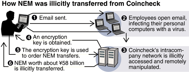 Computer devices of employees at Tokyo-based virtual currency exchange operator Coincheck Inc. were infected with viruses via emails several weeks prior to a massive theft of NEM cryptocurrency from the operator, The Yomiuri Shimbun has learned.