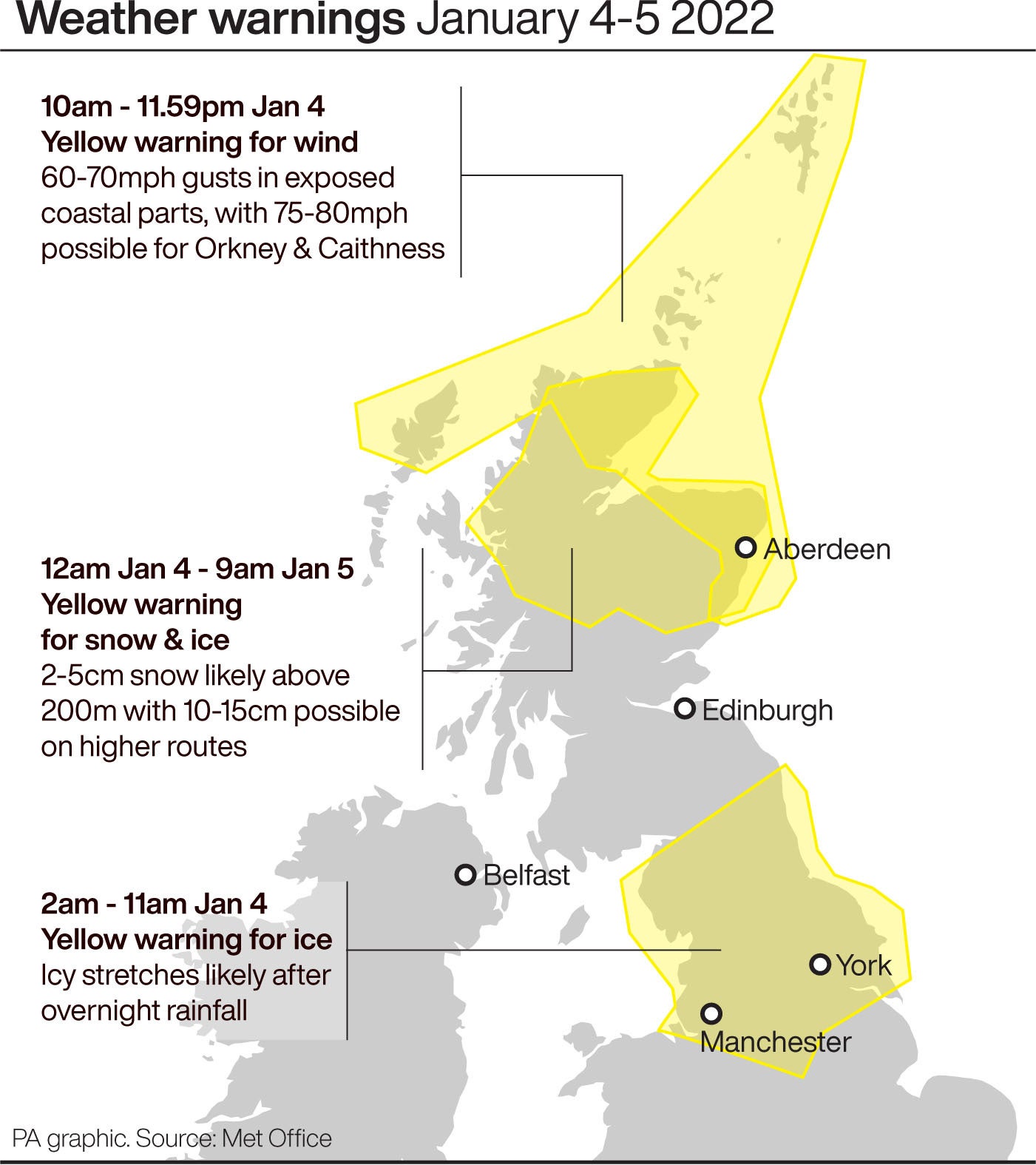 The Met Office warned of 60mph-70mph gusts, possibly stronger for a time, for Orkney and Caithness.