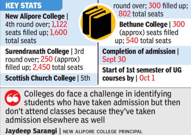 KOLKATA: Ten days after admission to undergraduate courses in colleges commenced, seats in many courses in several colleges remain empty, a cause for worry for hundreds of students who have scored over 90% in board results but are yet to get a seat in a subject and college of choice.