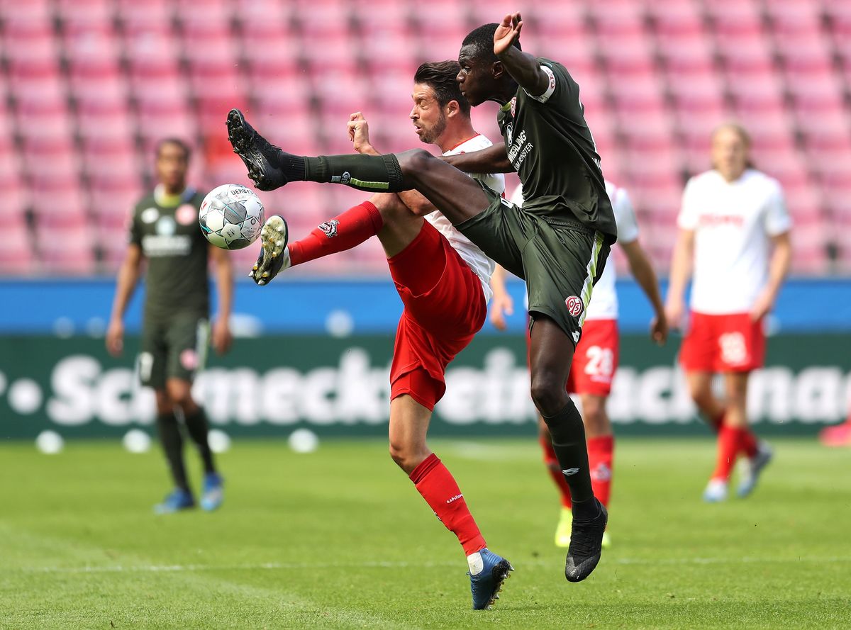 Soccer Football - Bundesliga - FC Cologne v 1. FSV Mainz 05 - RheinEnergieStadion, Cologne, Germany - May 17, 2020 1. FSV Mainz 05's Jerry St. Juste in action with FC Cologne's Benno Schmitz and John Cordoba, as play resumes behind closed doors following the outbreak of the coronavirus disease (COVID-19) Lars Baron/Pool via REUTERS