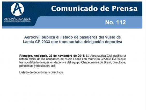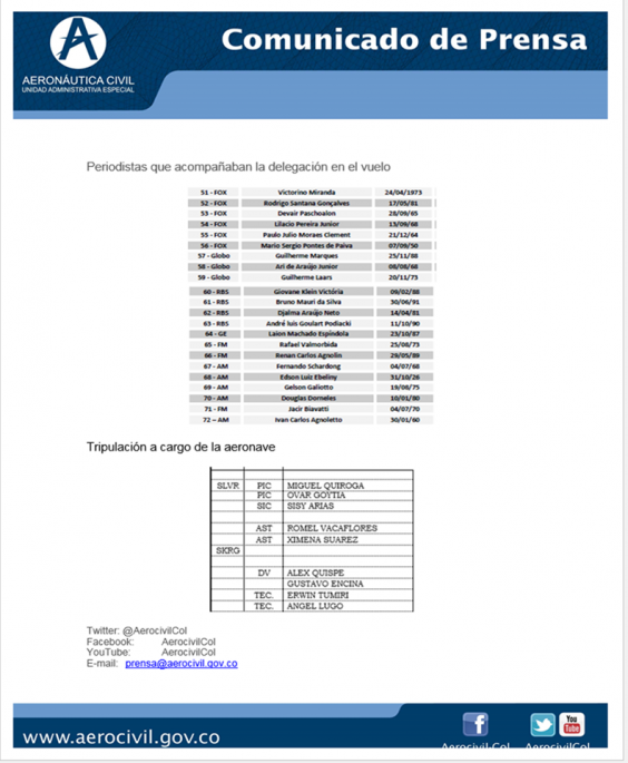 Colombia's Aeronatuica Civil posted the flight list on its Facebook page.