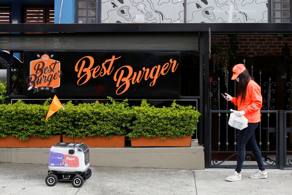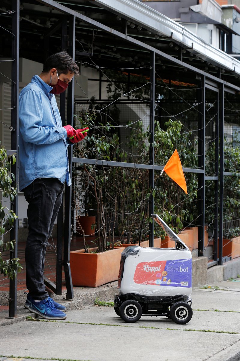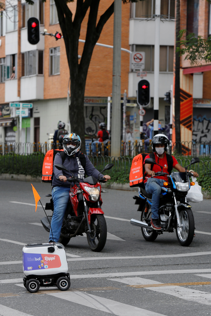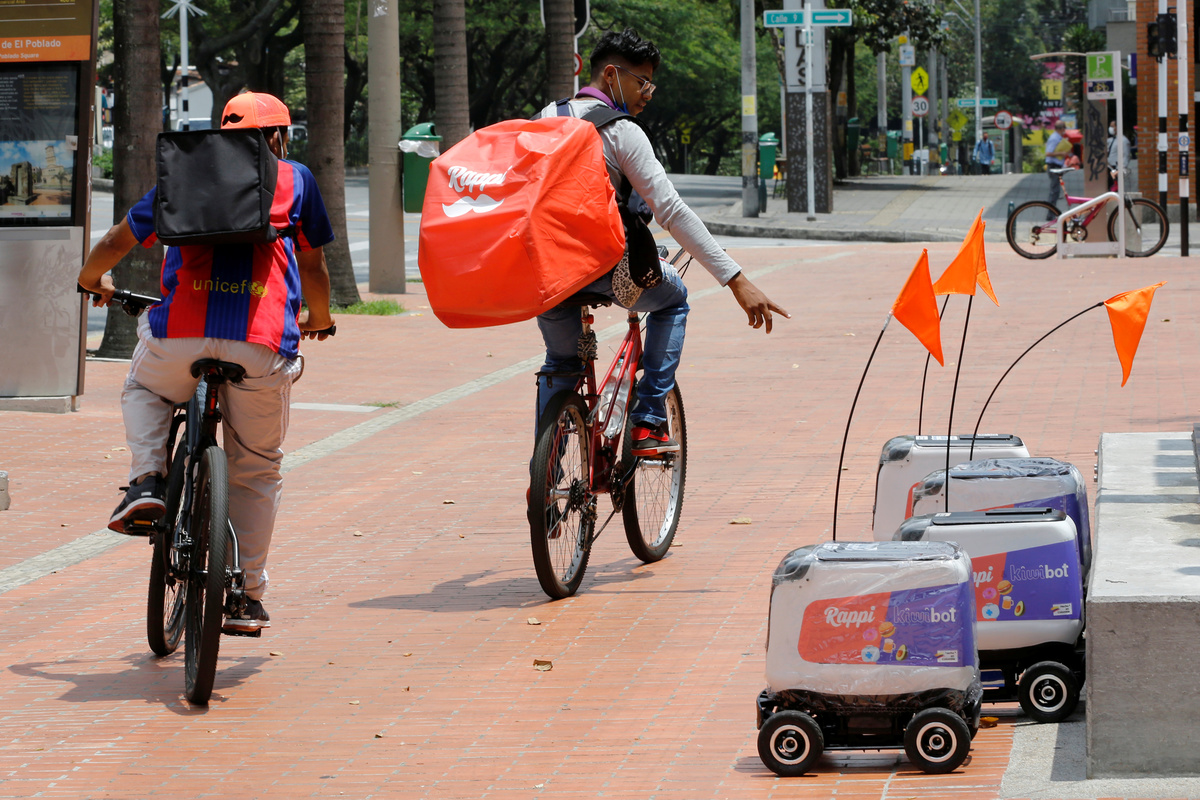 A delivery robot from the Colombian company Rappi travels down a street, amid the coronavirus disease (COVID-19) outbreak in Medellin, Colombia April 17, 2020. REUTERS/David EstradaRappi delivery woman wearing a face mask walks in front of a delivery robot from the Colombian company Rappi amid the coronavirus disease (COVID-19) outbreak in Medellin, Colombia April 17, 2020. REUTERS/David EstradaRappi delivery workers observe delivery robots from the Colombian company Rappi, amid the coronavirus disease (COVID-19) outbreak in Medellin, Colombia April 17, 2020. REUTERS/David EstradaFILE PHOTO: Rappi delivery men use their cell phones in Bogota, Colombia, September 12, 2019. Picture taken September 12, 2019. REUTERS/Luisa Gonzalez/File PhotoA man wearing a face mask puts a package inside a delivery robot from the Colombian company Rappi, amid the coronavirus disease (COVID-19) outbreak in Medellin, Colombia April 17, 2020. REUTERS/David EstradaPeople wearing face masks watch delivery robots from the Colombian company Rappi traveling down a street, amid the coronavirus disease (COVID-19) outbreak in Medellin, Colombia April 17, 2020. REUTERS/David EstradaRappi delivery workers watch a delivery robot from the Colombian company Rappi as it travels down a street, amid the coronavirus disease (COVID-19) outbreak in Medellin, Colombia April 17, 2020. REUTERS/David EstradaA man wearing a face mask uses his cell phone in front of a delivery robot from the Colombian company Rappi, amid the coronavirus disease (COVID-19) outbreak in Medellin, Colombia April 17, 2020. REUTERS/David EstradaA delivery robot from the Colombian company Rappi travels down a street, amid the coronavirus disease (COVID-19) outbreak in Medellin, Colombia April 17, 2020. REUTERS/David EstradaA delivery robot from the Colombian company Rappi, travels down a street, amid the coronavirus disease (COVID-19) outbreak in Medellin, Colombia April 17, 2020. REUTERS/David Estrada