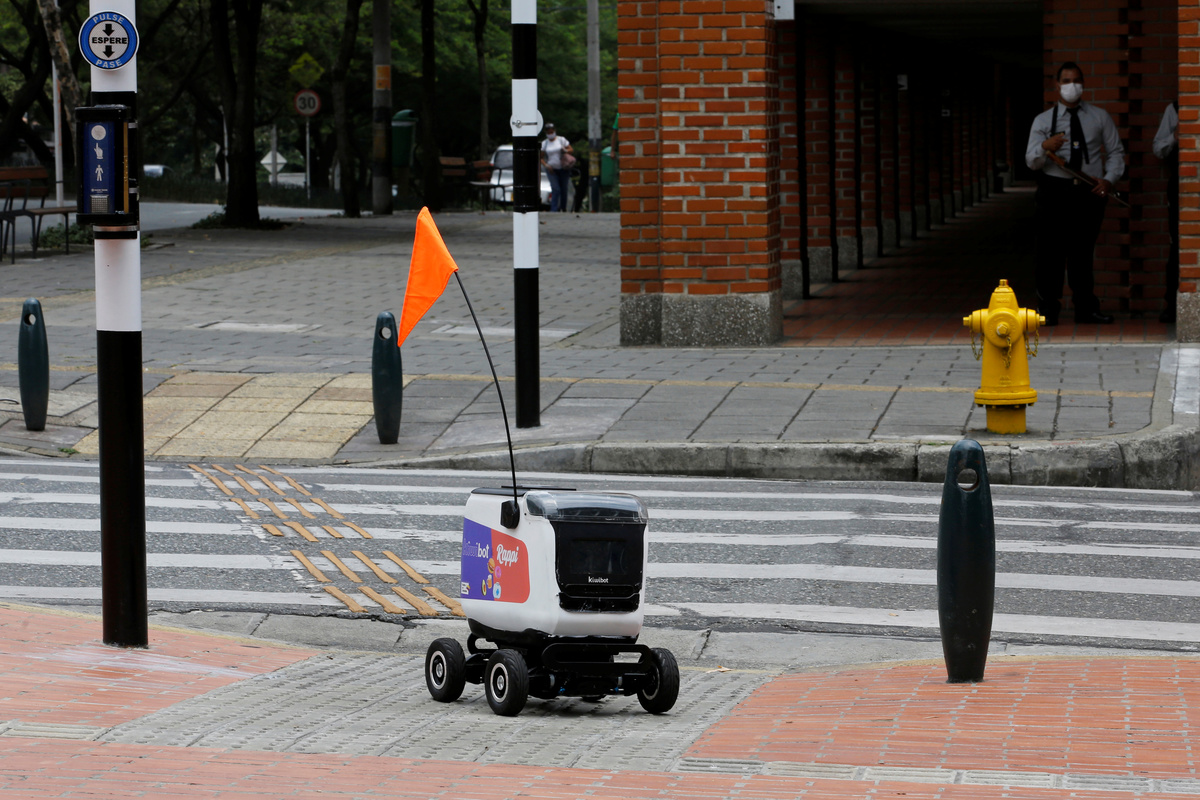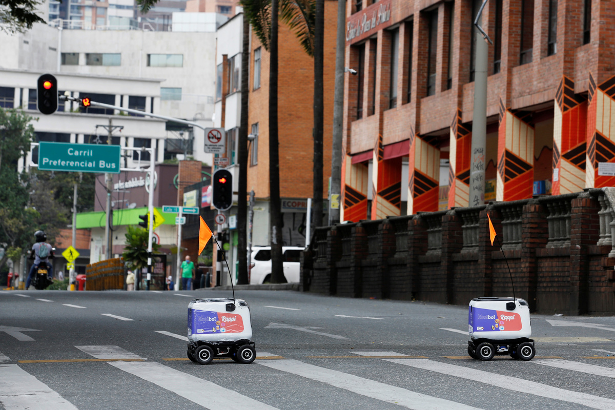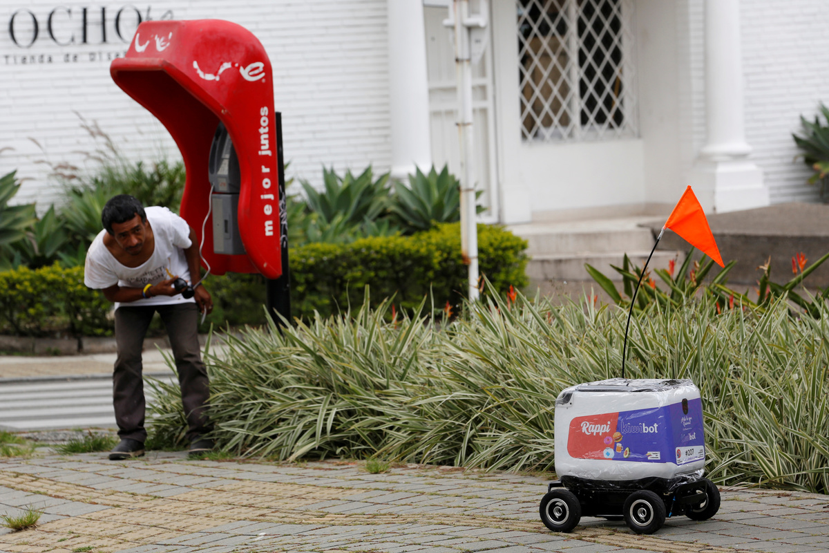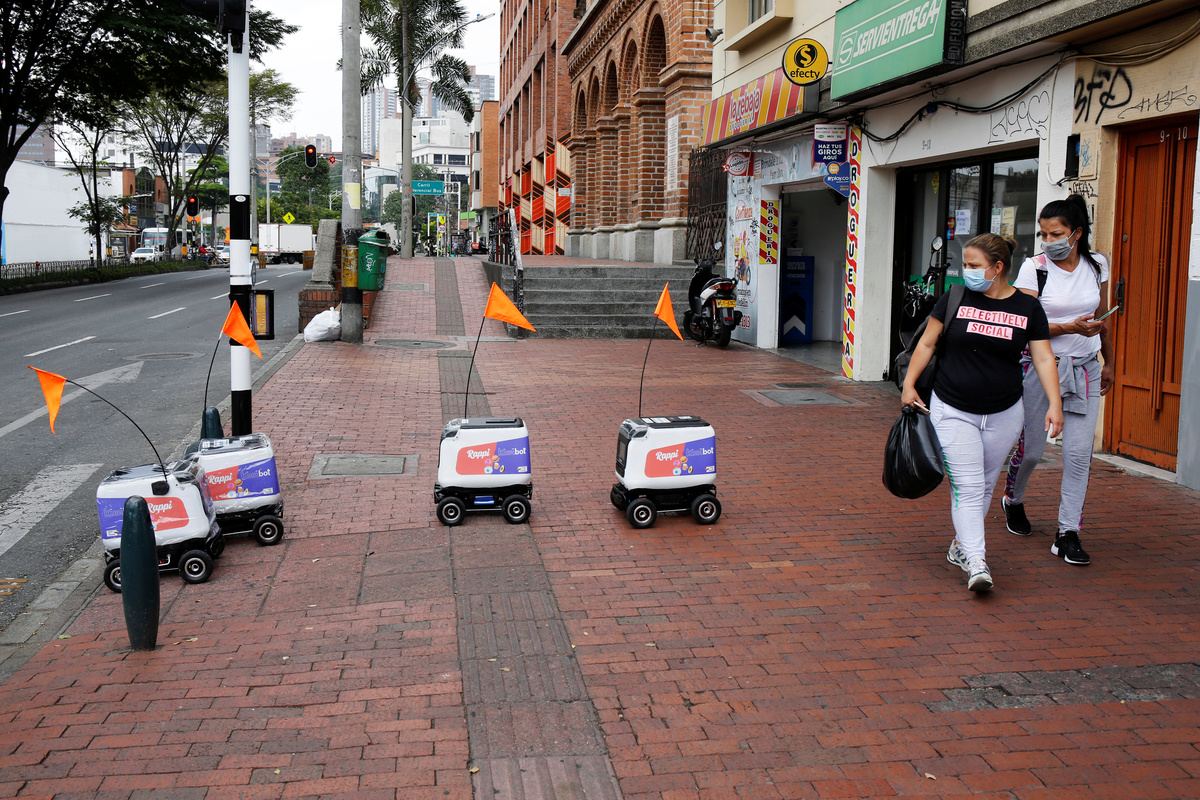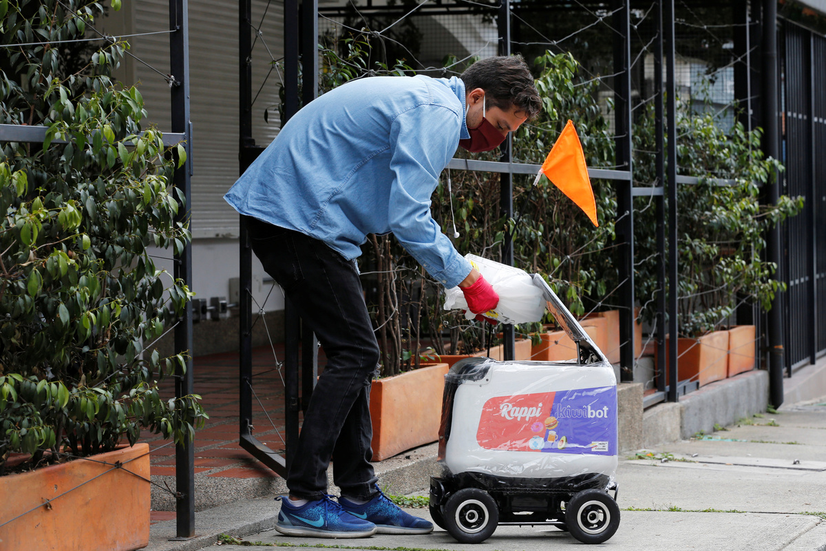 A delivery robot from the Colombian company Rappi travels down a street, amid the coronavirus disease (COVID-19) outbreak in Medellin, Colombia April 17, 2020. REUTERS/David EstradaRappi delivery woman wearing a face mask walks in front of a delivery robot from the Colombian company Rappi amid the coronavirus disease (COVID-19) outbreak in Medellin, Colombia April 17, 2020. REUTERS/David EstradaRappi delivery workers observe delivery robots from the Colombian company Rappi, amid the coronavirus disease (COVID-19) outbreak in Medellin, Colombia April 17, 2020. REUTERS/David EstradaFILE PHOTO: Rappi delivery men use their cell phones in Bogota, Colombia, September 12, 2019. Picture taken September 12, 2019. REUTERS/Luisa Gonzalez/File PhotoA man wearing a face mask puts a package inside a delivery robot from the Colombian company Rappi, amid the coronavirus disease (COVID-19) outbreak in Medellin, Colombia April 17, 2020. REUTERS/David EstradaPeople wearing face masks watch delivery robots from the Colombian company Rappi traveling down a street, amid the coronavirus disease (COVID-19) outbreak in Medellin, Colombia April 17, 2020. REUTERS/David EstradaRappi delivery workers watch a delivery robot from the Colombian company Rappi as it travels down a street, amid the coronavirus disease (COVID-19) outbreak in Medellin, Colombia April 17, 2020. REUTERS/David EstradaA man wearing a face mask uses his cell phone in front of a delivery robot from the Colombian company Rappi, amid the coronavirus disease (COVID-19) outbreak in Medellin, Colombia April 17, 2020. REUTERS/David EstradaA delivery robot from the Colombian company Rappi travels down a street, amid the coronavirus disease (COVID-19) outbreak in Medellin, Colombia April 17, 2020. REUTERS/David EstradaA delivery robot from the Colombian company Rappi, travels down a street, amid the coronavirus disease (COVID-19) outbreak in Medellin, Colombia April 17, 2020. REUTERS/David Estrada