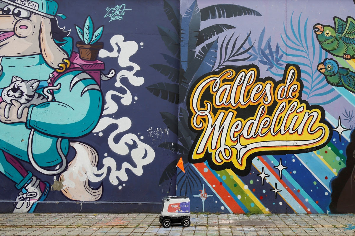 The pilot started this week in Medellin, Colombia's second-largest city. The boxy robots, which travel on four wheels and are decked with orange flags on their antennae, carry deliveries of up to 35 square centimeters (5 square inches) and are used to transport restaurant orders paid for digitally.
