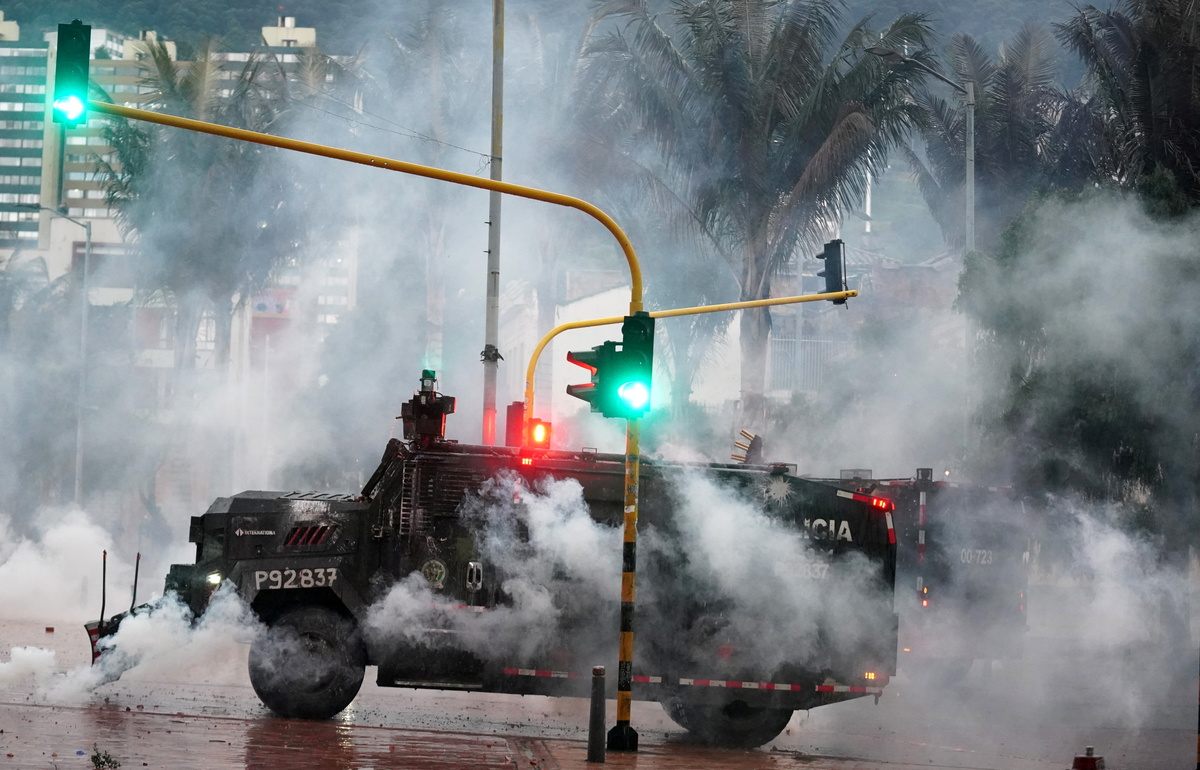 Riot police fired tear gas at protesters in Bogota on Wednesday during an eighth day of nationwide anti-government demonstrations, after crowds attacked police stations in the capital overnight.