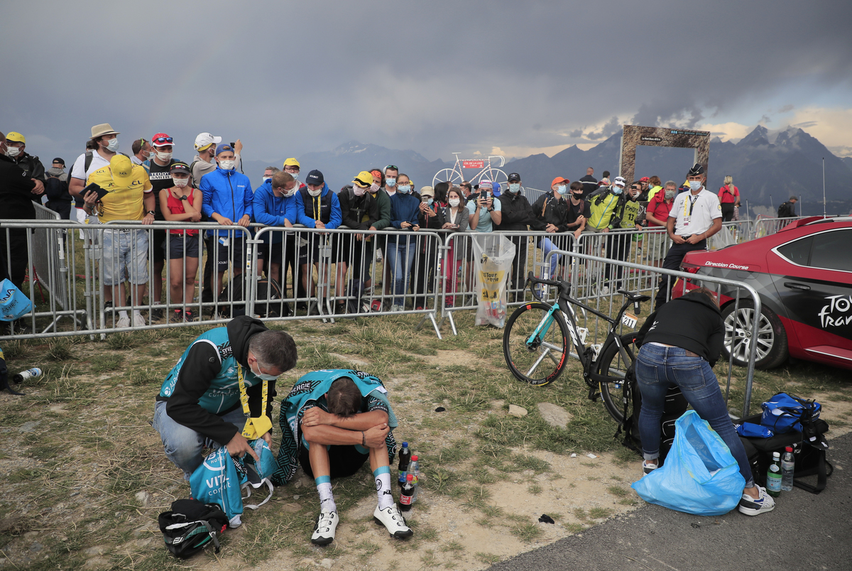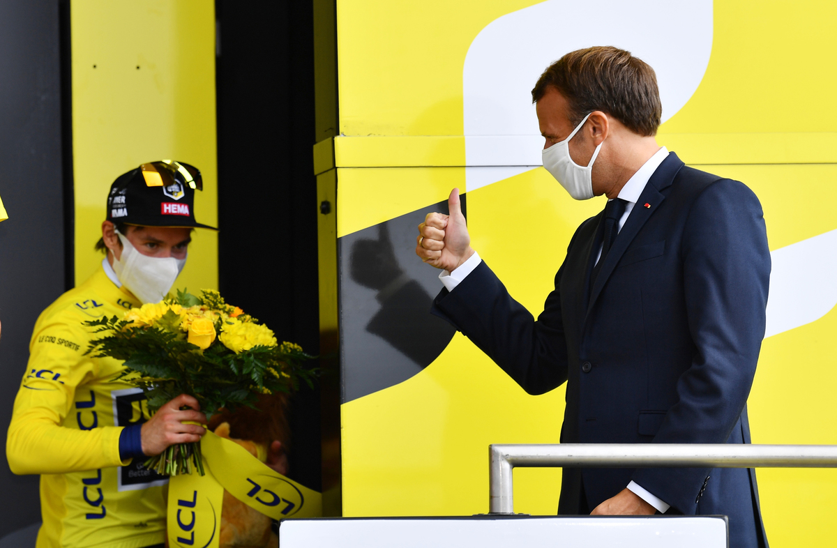 French president Emmanuel Macron followed part of the stage on the road, where hundreds of fans gathered despite the COVID-19 outbreak.