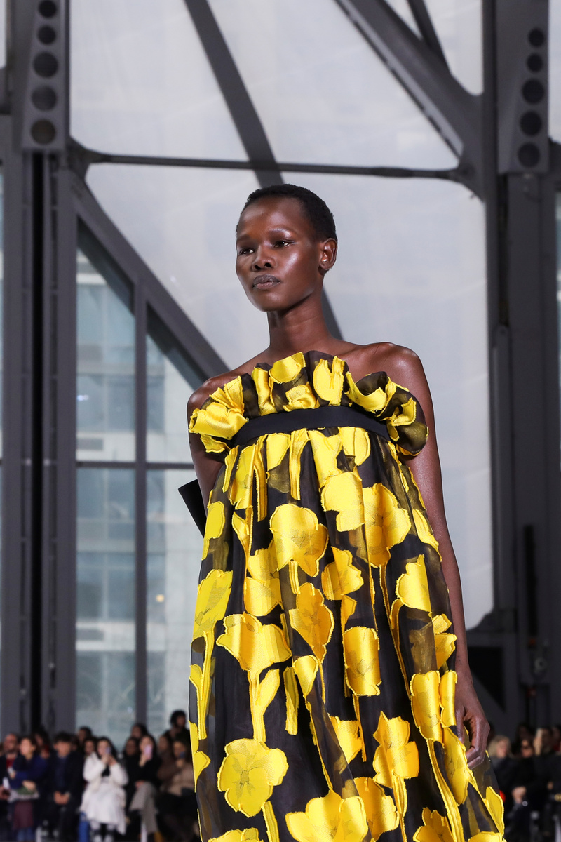 "This season my vision was to really focus on the idea of a grand gesture, of the drama of a disciplined exuberance, adding in that discipline. And, whether it's the sleeve or an embroidery or the color, finding out that one thing that's at the heart of the piece, and letting that shine, going all in for it," Gordon told Reuters after the runway show.