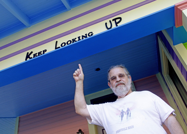 Above the front porch, in black letters are the words "Keep Looking Up."