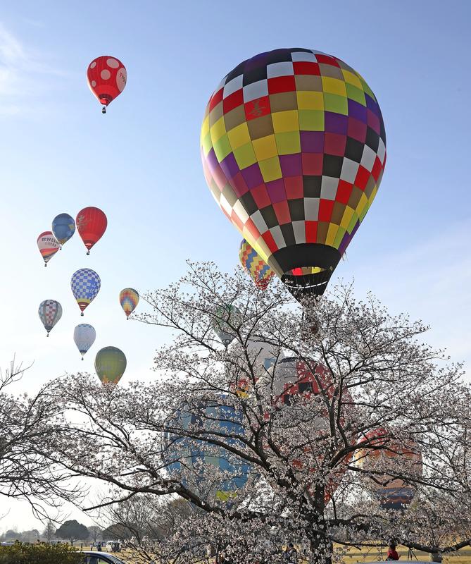 Colorful hot air balloons rise over blossoming cherry trees into the blue sky at the Fujioka Watarase athletic park in Tochigi city on Friday. The balloons participated in the Watarase balloon race 2019, the first of five events across Japan making up the 2019 hot air balloon Honda Grand Prix. The Watarase event runs from Friday through Sunday.