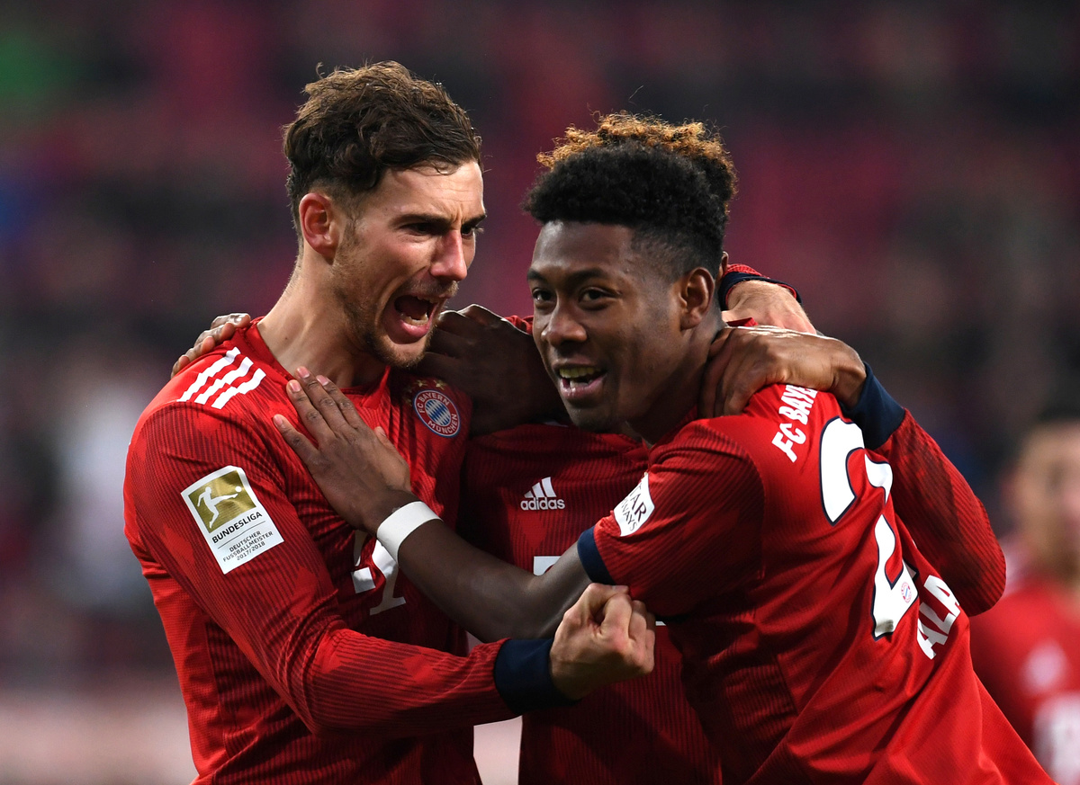 Soccer Football - Bundesliga - FC Augsburg v Bayern Munich - WWK Arena, Augsburg, Germany - February 15, 2019 Bayern Munich's David Alaba celebrates scoring their third goal with Kingsley Coman and Leon Goretzka REUTERS/Andreas Gebert DFL regulations prohibit any use of photographs as image sequences and/or quasi-video