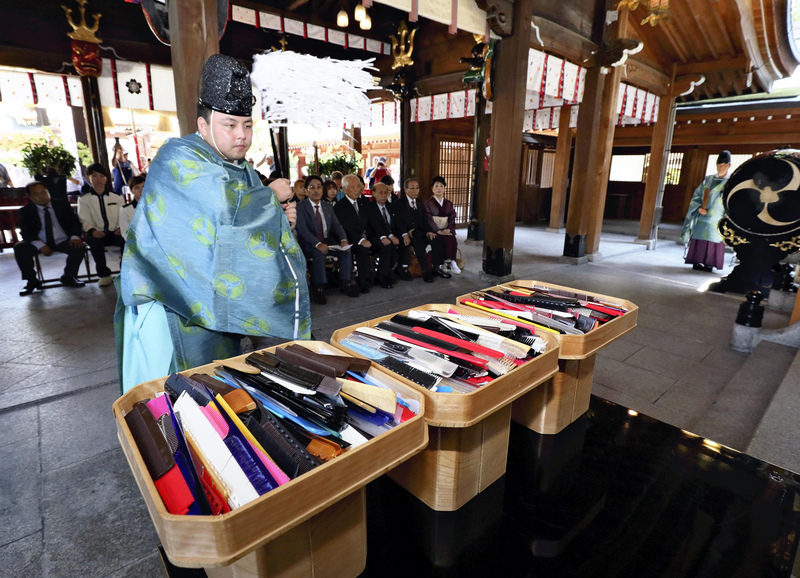 A priest prays over used combs at Kushida Shrine in Hakata Ward, Fukuoka, on Tuesday, as part of a memorial service for old combs that are no longer used. The ceremony took place on the day because Sept. 4 is regarded as the day of combs, as nine and four can be read "kushi" in Japanese -- just like the word for "comb." About 420 past-their-prime combs, such as those with broken teeth, that had been used at beauty salons and other places, were offered during the annual event, which started in 1996.