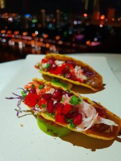 Seen taco with Alaskan king crab meat, guacamole, red cabbage, tobiko roe, mango, pomegranate and spiced mayonnaise.