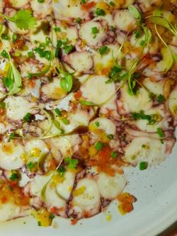Octopus carpaccio with lemon vinaigrette, capsicum, microgreen cilantro and chive.