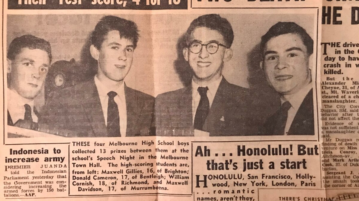 On a desk were some old yellowing newspaper clippings. One was of four boys who cleaned up the school prizes at Melbourne High in 1958. Gillies had won the prizes for drama, art, debating and the school newspaper prize.
