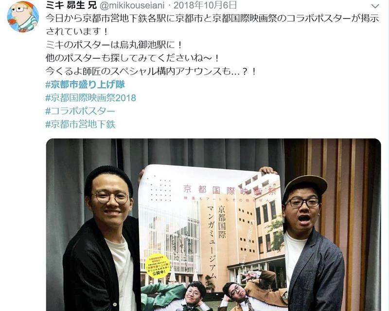 In October last year, Miki, a popular comedian duo from Kyoto, posted messages on Twitter. The tweets said, "From today, posters made in collaboration of the Kyoto city government and the Kyoto International Film and Art Festival go on display in stations of the Kyoto municipal subways," and "Let's boost Kyoto all together."