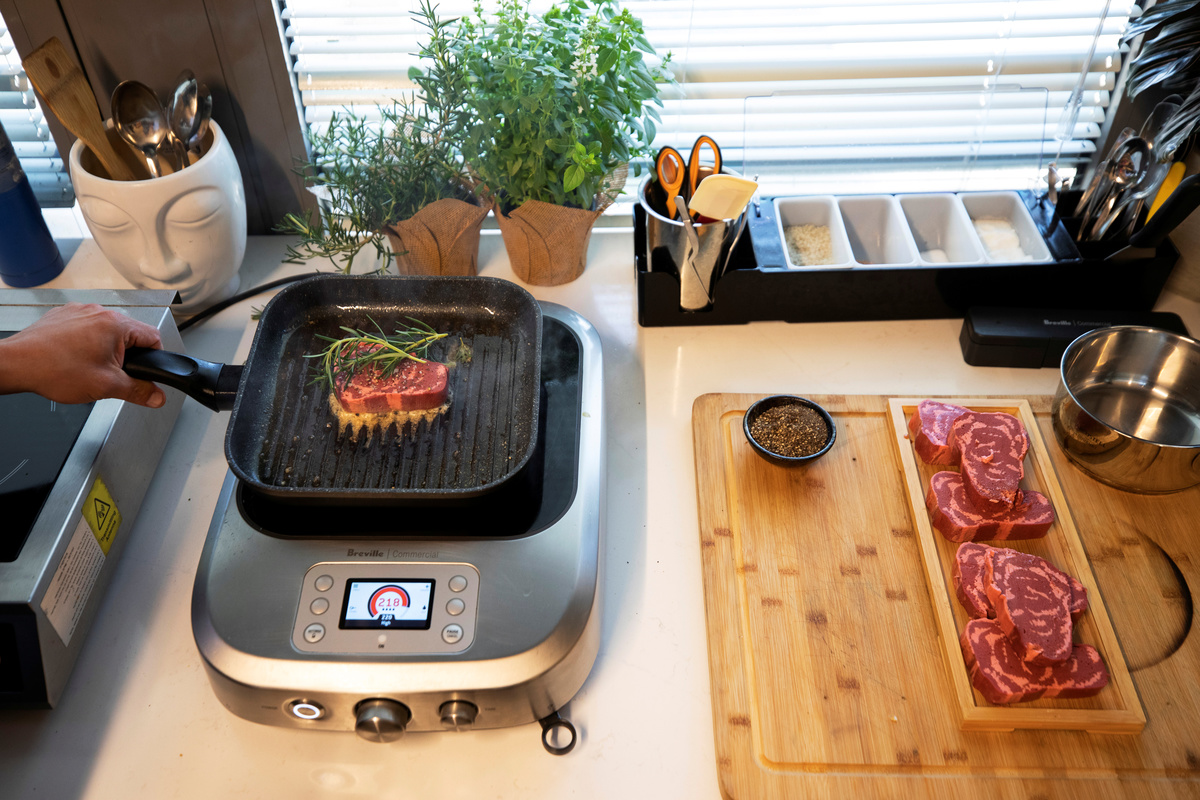 A food technician tests a cooked 3D printed plant-based steak mimicking real beef and produced by Israeli start-up Redefine Meat during a demonstration for Reuters at their facility in Rehovot, Israel June 29, 2020. REUTERS/Amir Cohen