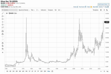 The quarterly silver futures chart, dating back to the 1960s, illustrates the parabolic move in silver futures that took the price to its highest level since 2011, and brought it within striking distance of the $49.82 high from that year and the all-time $50.36 peak from 1980.
