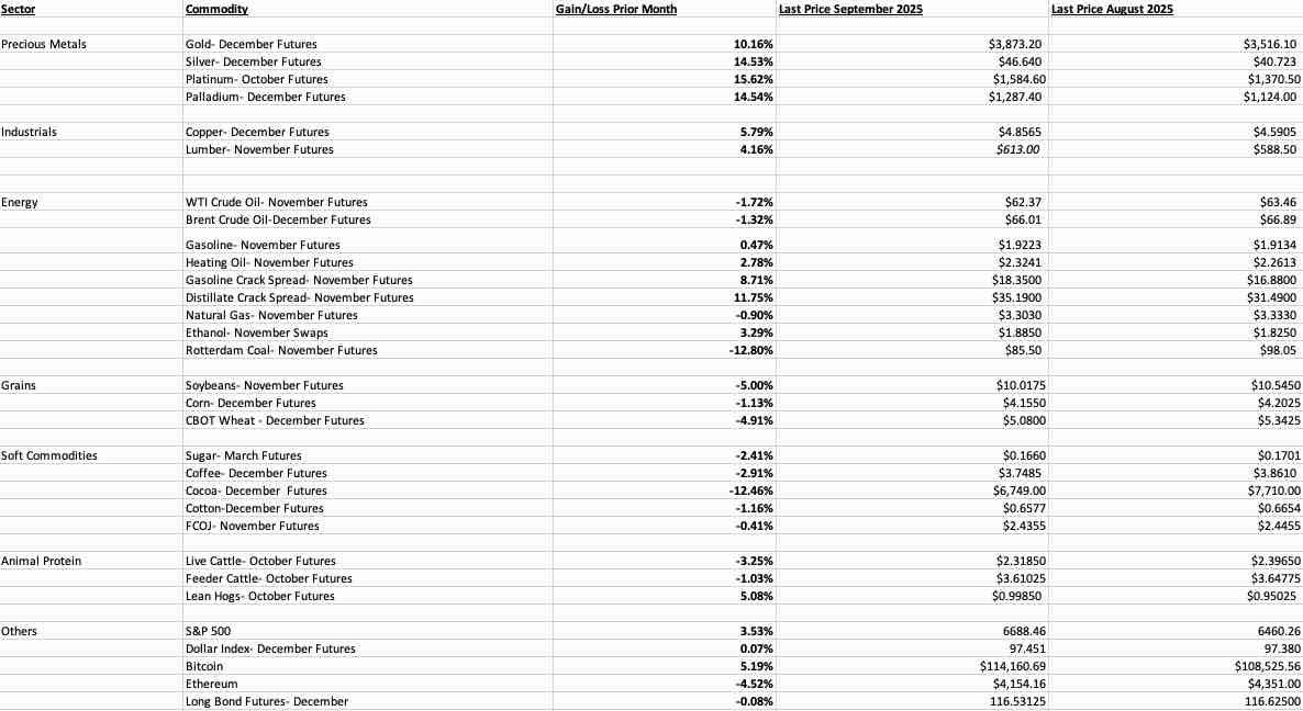 Precious metals significantly outperformed other commodities and commodity sectors for the month ending on Tuesday, September 30, in a month where the dollar index and bond futures were steady.