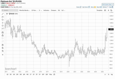 The monthly chart of NYMEX platinum futures for October 2025 delivery highlights the 15.62% September gain. After posting a bullish key reversal pattern in the second quarter, platinum surged to the upside, leading the precious metals sector and reaching its highest price since February 2014.