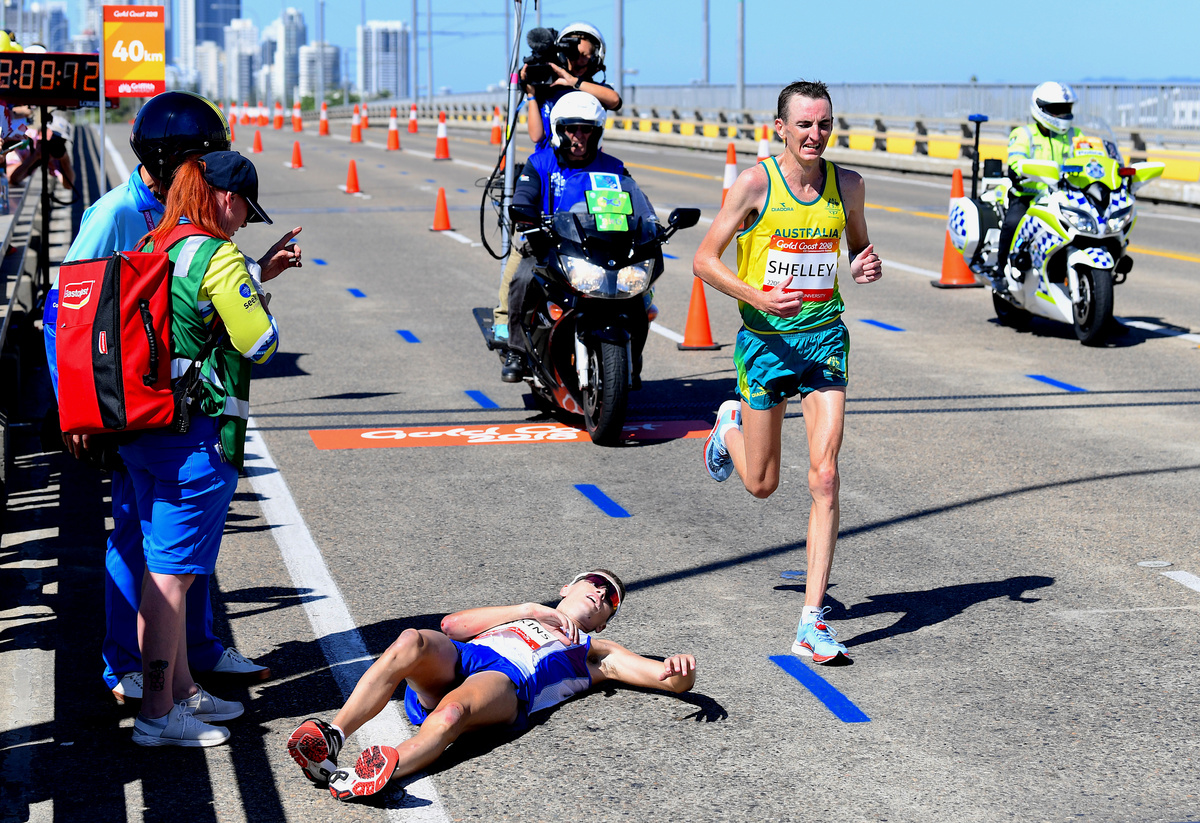 Hawkins held a lead of almost two minutes after two hours running in temperatures of 28 degrees Celsius (82F) before weaving across the road and collapsing.