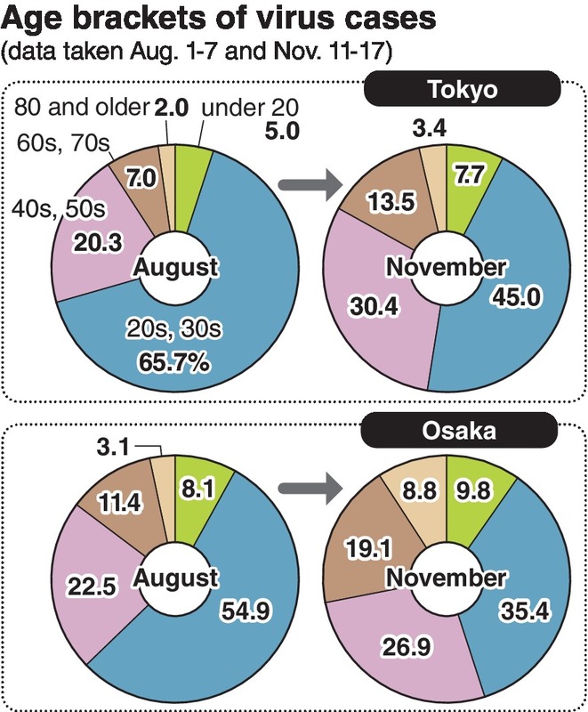 The increase in the number of virus cases can also be attributed to a rise in the number of tests. With the enhancement of the testing system, the number of tests conducted per day in Tokyo has increased from a maximum of about 1,700 in April to more than 8,500 on Nov. 16.