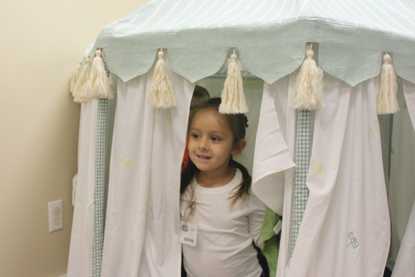 Once children are safely in the large playroom _ complete with a chalk wall, a tent and plenty of toys _ the adults and youths find their seats, ready for music and announcements.