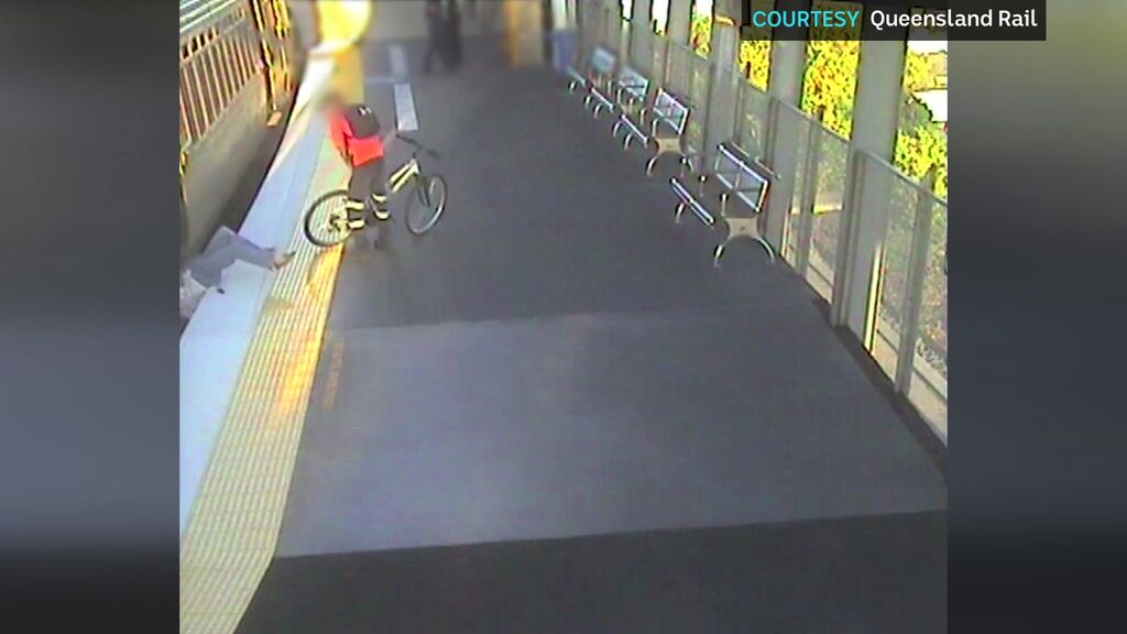 In some of the footage released by Queensland Rail, a boy is seen slipping completely between the train and a Roma Street platform while walking with a woman.