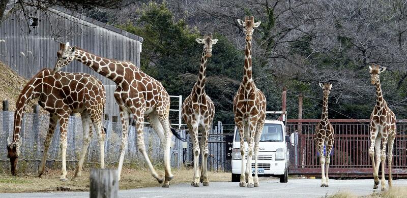 MINE, Yamaguchi -- A daily wintertime spectacle involving a family of giraffes likened to their "commuting" to work has been entertaining visitors at a safari park in Mine, Yamaguchi Prefecture.
