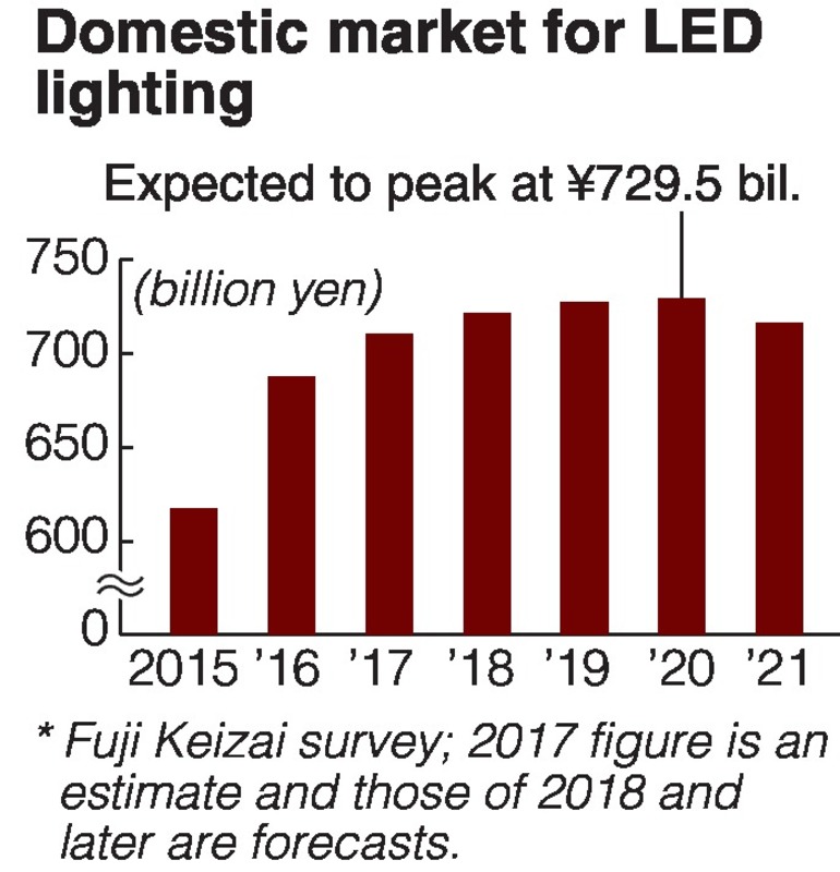 According to market research firm Fuji Keizai Co., only about 20 percent of shops and 10 percent of offices and buildings used LED lights in 2017.