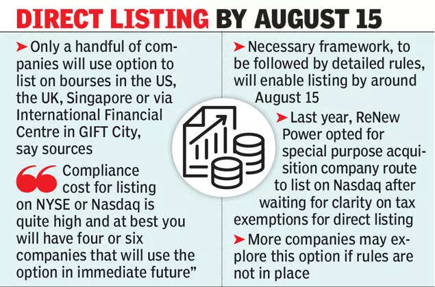 “The compliance cost for listing on the NYSE or Nasdaq is quite high and at best you will have four or six companies that will use the option in the immediate future,” said a source. Providing the necessary framework, which will be followed by the detailed rules from the ministry of corporate affairs, will enable listing by around August 15, the 75th anniversary of India’s independence, market players said.