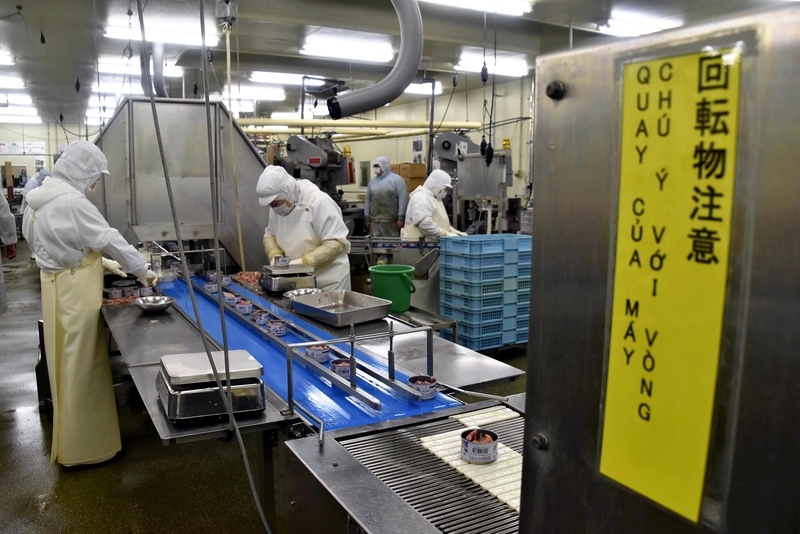At a nearby workbench, technical interns from Vietnam were processing mackerel and saury and packing them into cans. "Without them, we can't sustain our company," Yasuyuki Tsuda, 65-year-old president of the company, said, speaking frankly on the matter.