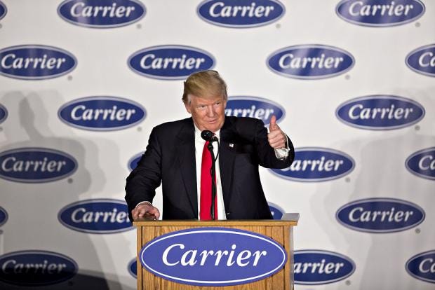 In exchange for $7m (£5m) in state tax credits, the firm agreed to retain 770 of roughly 1,400 positions at a Carrier plant in Indianapolis and send the rest to Monterrey, Mexico. Greg Hayes, the company’s chairman and chief executive, later suggested federal contracts also played a role. He said: “I was born at night, but not last night.... I also know that about 10 per cent of our revenue comes from the US government.”