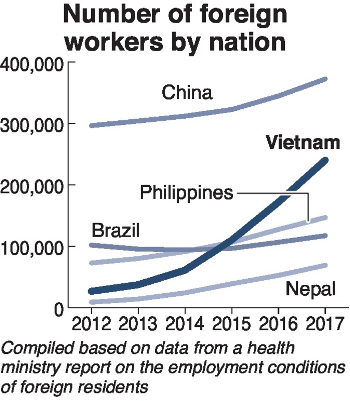 The number of Vietnamese workers in Japan last year rose to 240,000 -- second-highest behind Chinese -- up nine-fold over five years, according to the health ministry survey. Vietnamese workers are in high demand to replace Chinese workers, as wages in China have risen. The Vietnamese government actively dispatching workers overseas as a primary means of earning foreign currency.