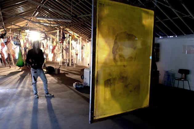 View of the Glass Onion Shop exhibition, which includes Gavin Turk's ink-silkscreen Faded Glory, at Rochelle School, ShoreditchPhotograph: Martin Godwin/GuardianArabesques by Aishleen Leicester, made from sugar and resin, at The Glass Onion Shop exhibition, Rochelle School, ShoreditchPhotograph: Martin Godwin/GuardianView of Make Believe exhibition, including Jodie Careys' Furniture Arrangement II, in an old warehouse, near Shoreditch High StreetPhotograph: Martin Godwin/Guardian