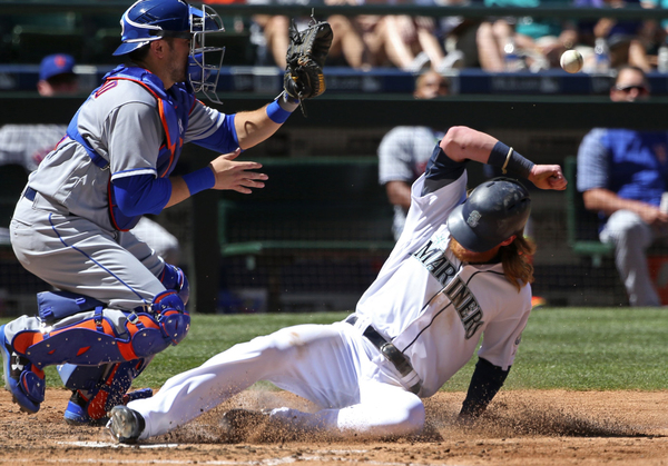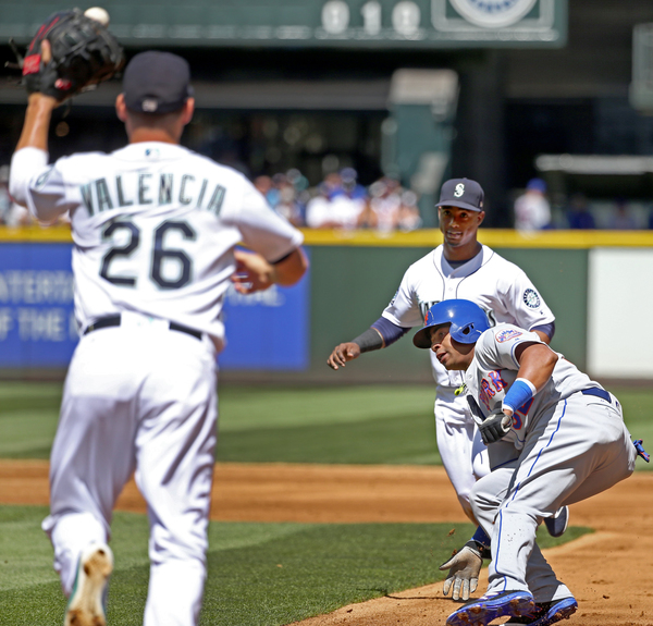The Mets tacked on two more runs that inning off newly acquired Mariners reliever David Phelps: two-out RBI singles to Neil Walker and Curtis Granderson. Granderson's single, a sharp line drive, deflected off the glove of Mariners first baseman Danny Valencia.