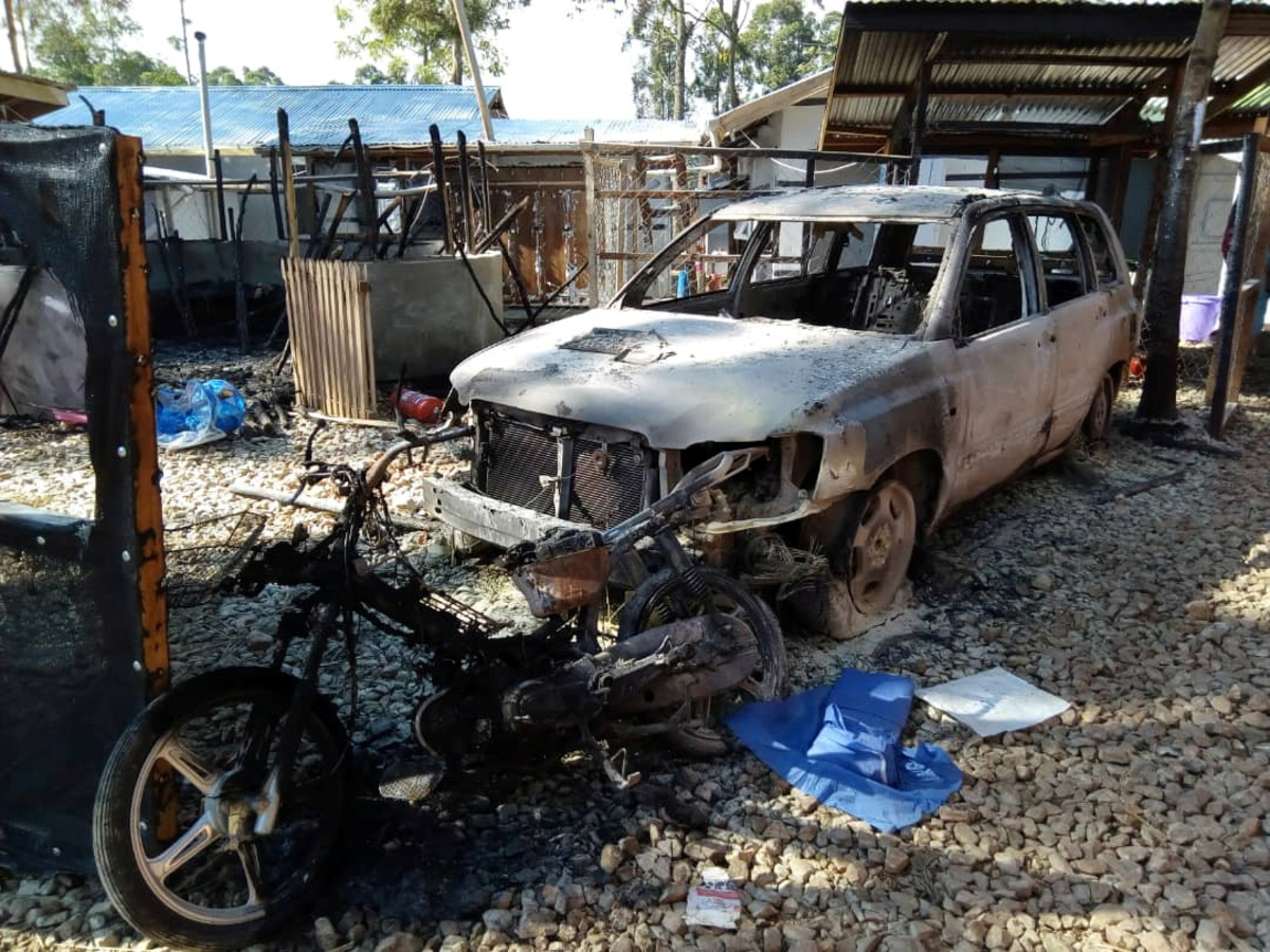 Burned cars are seen after attackers set fire to an Ebola treatment center run by Medecins Sans Frontieres (MSF) in the east Congolese town of Katwa, Democratic Republic of Congo February 25, 2019. Picture taken February 25, 2019. Laurie Bonnaud/MSF/Handout via REUTERS
