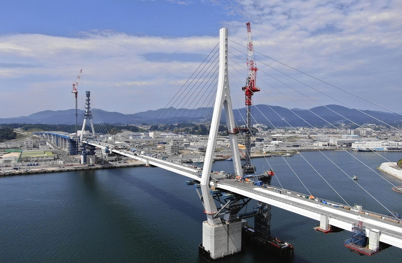 Construction is progressing on the Kesennuma Bay bridge, connecting the north and south sides of Kesennuma Bay in Kesennuma, Miyagi Prefecture. The bridge is a part of the Sanriku Expressway, which was created after the Great East Japan Earthquake as a part of its "restoration road." The Land, Infrastructure, Transport and Tourism Ministry's Tohoku region maintenance bureau announced on Friday that it aims to finish the bridge by the end of the year.