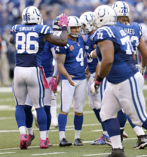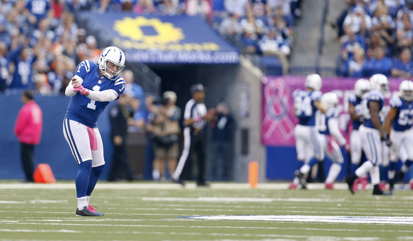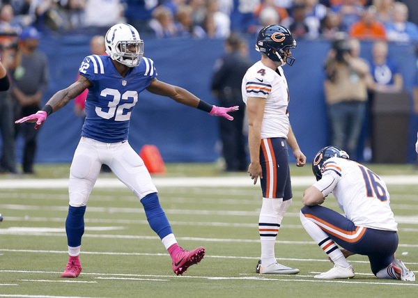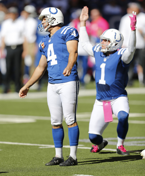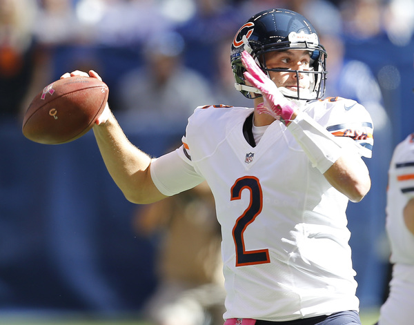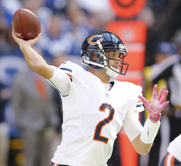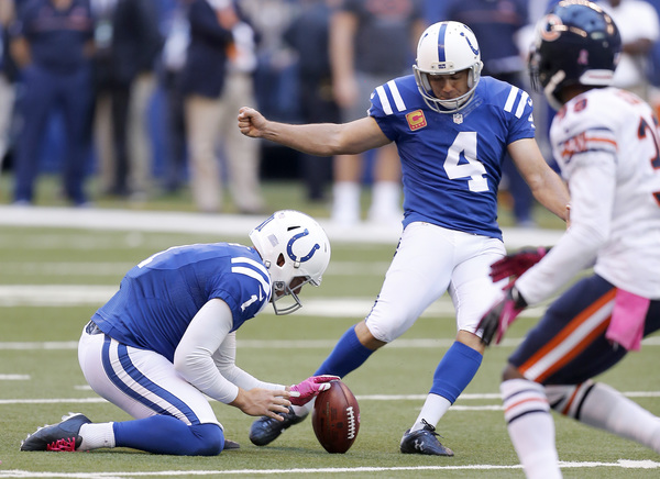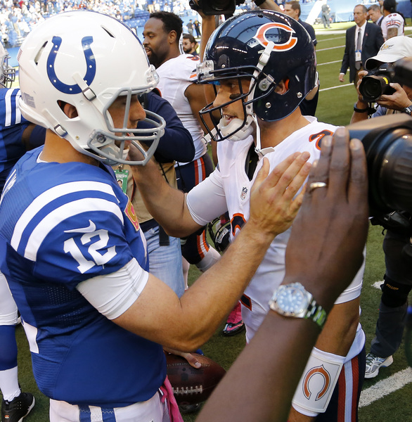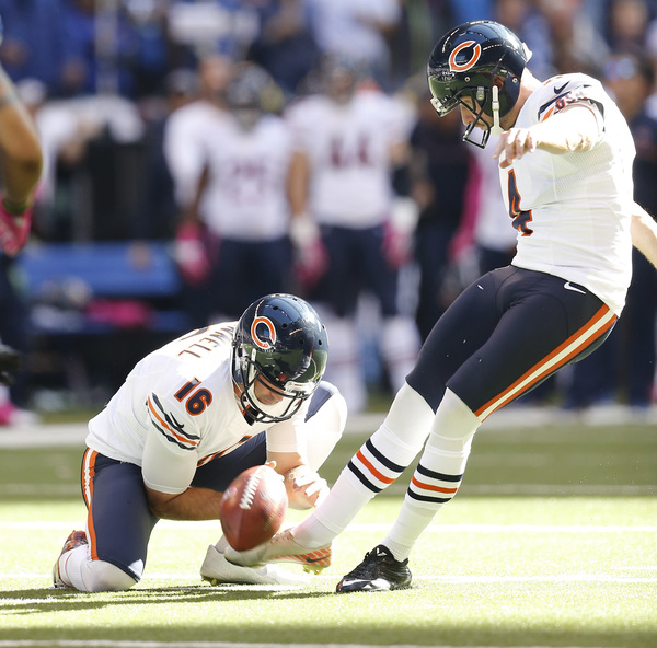 The Bears were left needing a touchdown to win on their final possession. Had Barth connected on his kick earlier in the half, perhaps they would have needed only a field goal to tie. Adding to the Bears' misery: Colts kicker Adam Vinatieri made all five of his field-goal attempts, including kicks of 54 and 53 yards. Vinatieri has made 38 consecutive kicks dating to Week 3 of last season. In that same span, the Bears' kickers are 32-for-41 (78 percent).