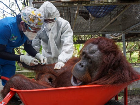 Due to the orangutans’ susceptibility to human respiratory illnesses, veterinarians wore protective suits and masks during final medical checkups before the apes were moved into the forest.