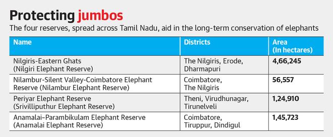 In a renewed effort, the Tamil Nadu government, on World Elephant Day, notified 1,197 sq. km. in Agasthyamalai in Tirunelveli and Kanniyakumari districts (most of it protected area) as the State’s fifth elephant reserve. According to the 2017 census, the new reserve has about 200 elephants.