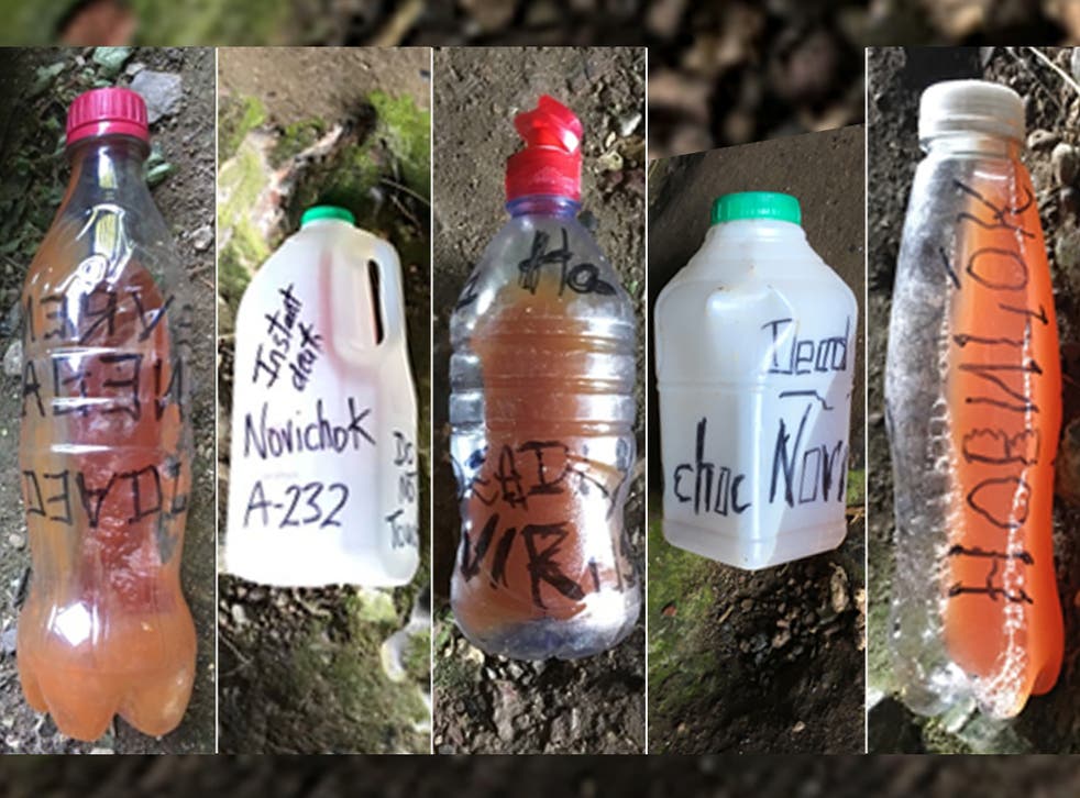 Two of the bottles were labelled Novichok, the lethal nerve agent used to try to assassinate Russian double agent Sergei Skripal and his daughter Yulia in March of the same year.