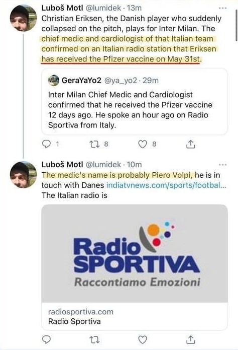 As Vice reports, the rumour began after a Czech theoretical theorist named Lubos Motl tweeted that the chief medic and cardiologist at Inter Milan had told Radio Sportiva that Eriksen had been given the Pfizer vaccine on 31st May.