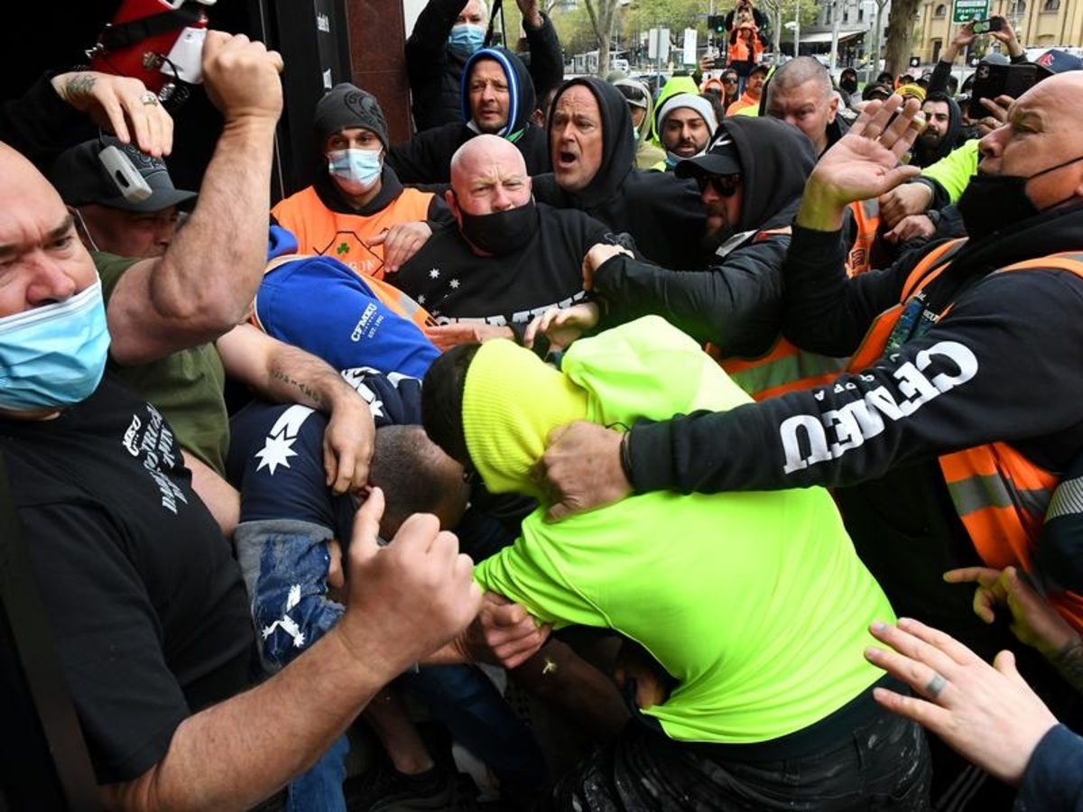 Hundreds of construction workers wearing high-vis, and their supporters, stormed the building, protesting against new mandatory vaccination rules for the building industry.