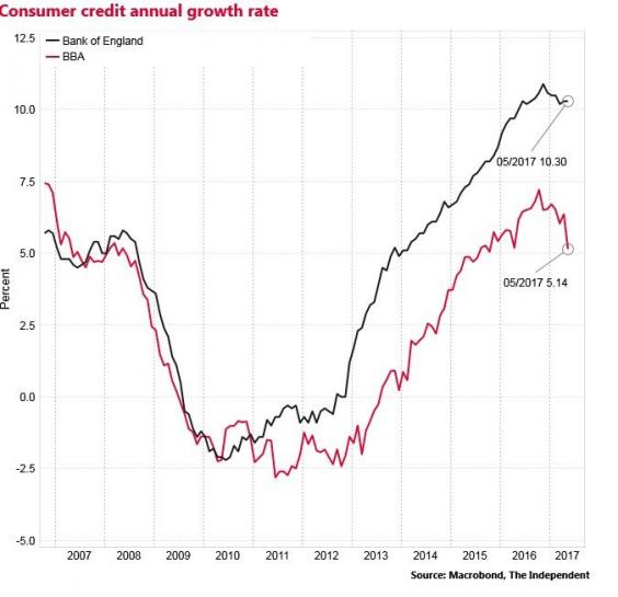 The latest Bank data tells a different story to that of the British Bankers' Association, which reported a sharp drop in the annual growth rate of consumer credit from 6.4 per cent in April to 5.1 per cent in May, the weakest since October 2015.