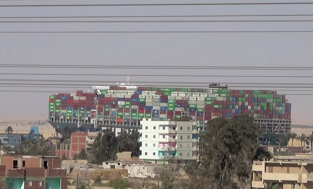 The Panama-flagged vessel was heading for Rotterdam when it plowed into the sandy bank of a single-lane stretch of the canal about 6 kilometers (3.7 miles) north of the southern entrance, near the city of Suez on March 23.